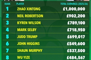体育资讯4月18日讯 斯诺克世锦赛即将打响,作为奖金最高的赛事,50万英镑冠军奖金将大幅度改变单赛季球员奖金收入的排行,以下是目前单赛季奖金收入排行榜。