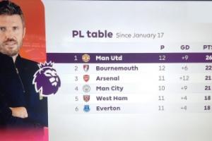 体育资讯04月19日讯 本轮英超,切尔西0-1不敌曼联。如果比较卡里克上任后的英超积分榜,卡里克率领的曼联高居英超第一。